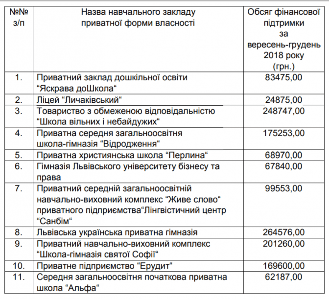Нагадаємо, з квітня 2017 року у Львові діє програма підтримки приватних навчальних закладів, що має на меті сприяти розвитку освітньої мережі, покращити доступ до освіти та матеріальну базу приватних освітніх закладів, створити додаткові місця у дитсадках. За підрахунками депутатів, підтримка приватних шкіл вигідніша для бюджету, ніж створення нових комунальних шкіл і садків.