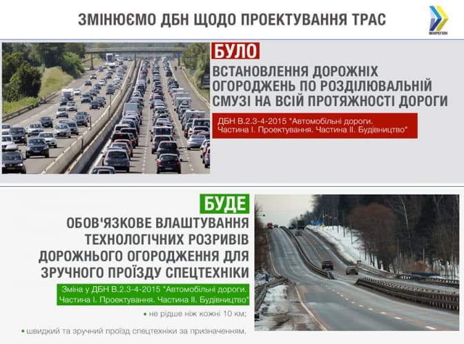 Натомість у нинішніх ДБН передбачені дорожні огородження по розділювальні смузі на всій протяжності дороги без розривів.