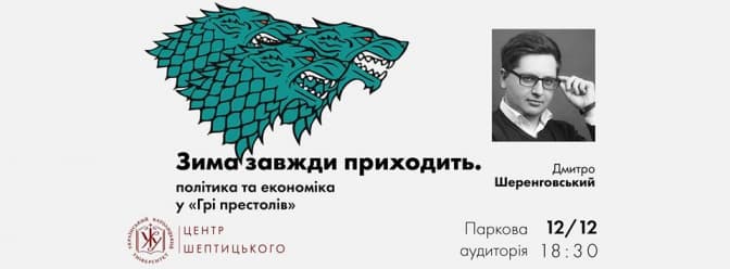 Всіх фанатів «Гри Престолів» збирають в четвер, в парковій аудиторії Центру Шептицького. На порядку денному – популісти Вестероса, політичні теорії та авіація проти драконів. Про політику і економіку світу «Гри Престолів» говоритиме Дмитро Шеренговський.