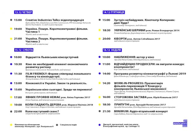 В рамках «Днів українського кіно» глядачі зможуть не тільки відвідати кінопокази, а й майстри-класи по створенню фільмів, процесу зйомок та роботі кінокомісії. Ці зустрічі відбудуться в львівському Музеї етнографії, що на проспекті Свободи, 15. Дивитися кіно в рамках фестивалю, львів’ян запрошують до кінотеатру «Коперник», який в жовтні цього року закрили через суд.