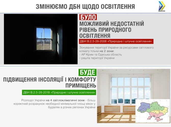 «Світлокліматичні зони беруться до уваги у розрахунку необхідного рівня природного освітлення і мінімального розміру вікон при проектуванні приміщень. 2 світлокліматичні зони – це не зовсім коректно. Адже територія країни не мала і зміни у світловому кліматі набагато відчутніші», – каже урядовець.