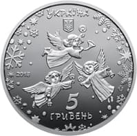 На аверсі монети на дзеркальному тлі розміщено угорі напис «Україна», під яким малий Державний Герб, у центрі – три янголи, ліворуч – рік карбування (2018), унизу – номінал (5 гривень). По колу – стилізоване зображення сніжинок та зірочок. На реверсі монети зображено кольорову різдвяну зірку – один із символів народного обряду колядування, стародавній символ сонця, вогню і тепла. Навколо зірки – напис «З Новим роком та Різдвом Христовим».