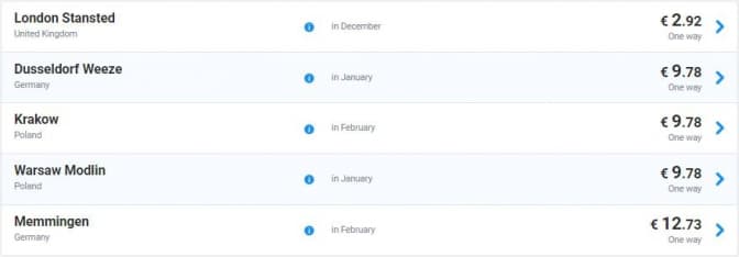 Так, зі Львова можна придбати квитки у Лондон за ціною від 2,9 євро в одну сторону. Квитки у Дюссельдорф, Краків і Варшаву на дати у січні та лютому можна придбати за ціною від 9,78 євро, а у напрямку Львів – Меммінгем – від 12,73 євро.