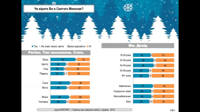 Водночас, лише 43% вказали, що вірять у Святого Миколая (проти 37% у 2016), а половина опитаних – не вірять в нього. Найбільше вірять у Святого Миколая на Заході (63%), в інших регіонах таких трохи більше третини. Не вірять у святого Миколая 32% мешканців західних областей, а ще 5% відповіли, що не знають такого свята. Чим молодші та чим більш забезпечені респонденти, тим більше вони вірять в Святого Миколая. Також більше їх серед жінок і мешканців сіл.