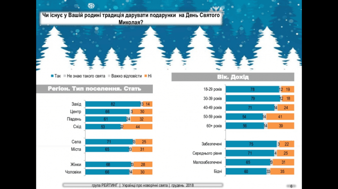 Соціологічна група «Рейтинг» провела соціологічне опитування про ставлення українців до зимових свят. 2 тисячі респондентів, старших за 18 років, розповіли про те, чи вірять вони у святого Миколая (або Діда Мороза), чи дарують у цей день подарунки, та що люблять більше – Новий рік чи Різдво.