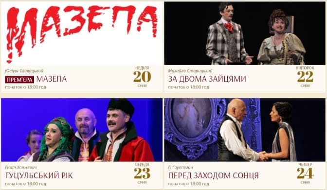 Запрошує відвідувачів на такі вистави: