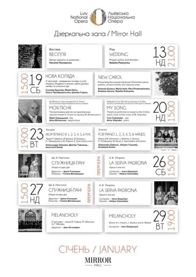 Львівський національний академічний театр опери та балету імені Соломії Крушельницької в січні оприлюднив афішу Дзеркальної зали: