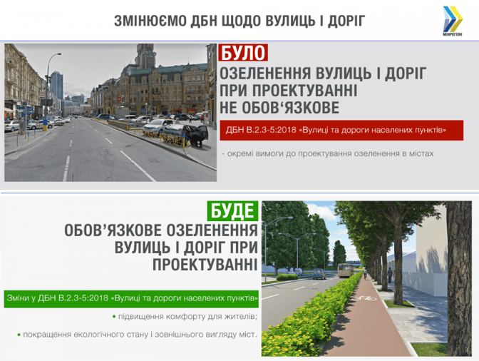 При проектуванні вулиць та доріг в Україні пропонують впровадити обов’язкове їх озеленення. Відповідні зміни до Державних будівельних норм «Вулиці та дороги населених пунктів» розробляють у Мінрегіонбуді, пише на своїй сторінці у Facebook заступник міністра регіонального розвитку Лев Парцхаладзе.