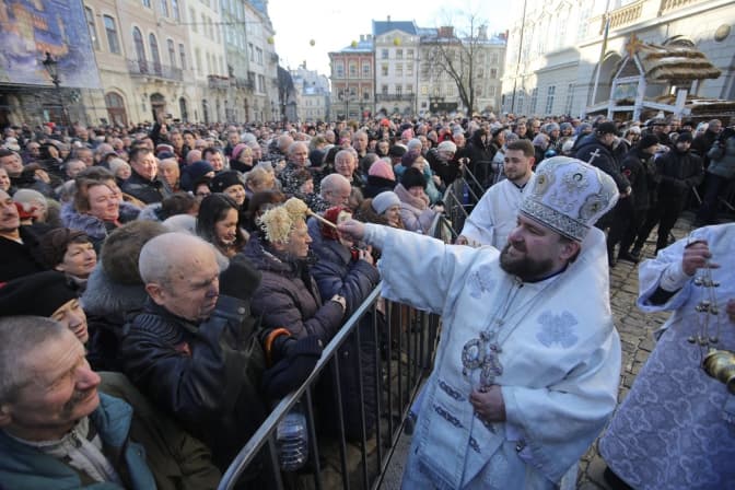 Загальноміське освячення води почалося сьогодні, 19 січня, о 13:00 з виступів львівських хорів, які заспівали колядки.