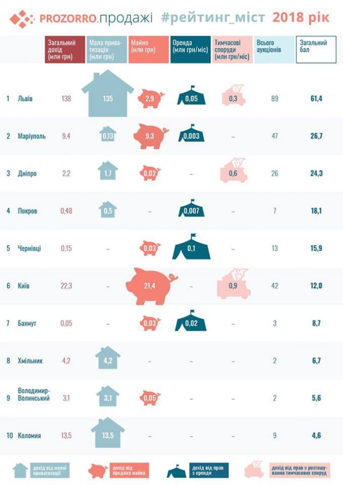Рейтинг враховував 4 напрямки, за якими муніципалітети працюють в системі ProZorro.Продажі: мала приватизація, оренда нерухомості, продаж майна та оренда тимчасових торгових місць.