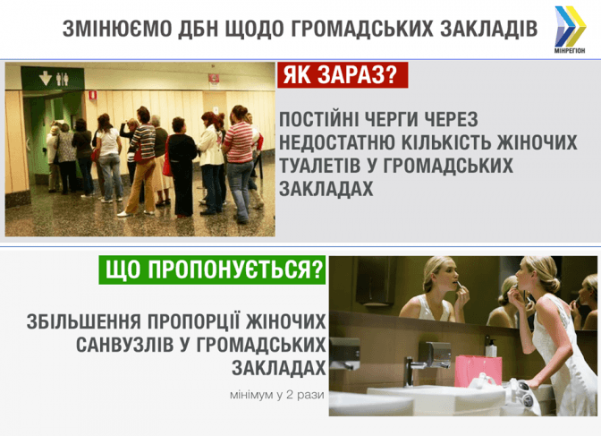 «До нас надійшла пропозиція проаналізувати міжнародний досвід та внести зміни у ДБН щодо можливого збільшення кількості жіночих туалетів у громадських закладах. Мінімум у два рази, аби збільшити їхню пропускну здатність», – пише Лев Парцхаладзе.