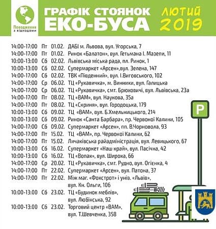 Прес-служба ЛМР опублікувала актуальний графік стоянок екобуса. У лютому відпрацьовані лампи та батарейки можна буде здати по п'ятницях та суботах.