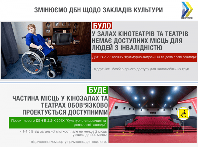 У проекті нових ДБН щодо закладів культури пропонується ввести норму – частину місць у кінозалах, театрах та операх робити зручними для людей з інвалідністю. Про це у Facebook повідомив заступник міністра регіонального розвитку Лев Парцхаладзе.
