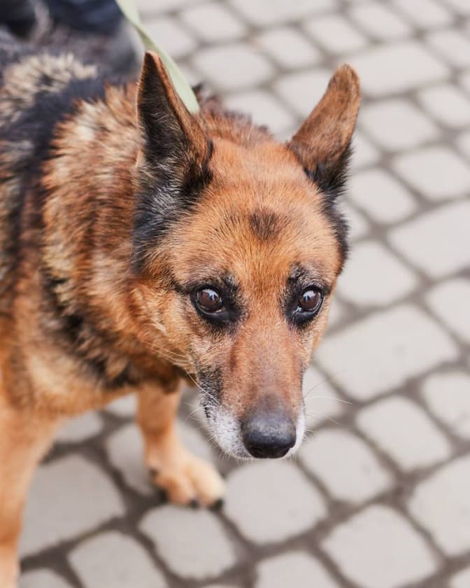 Метис німецької вівчарки Кайра має вже вікові проблеми з зором. Проте тварина дружня та слухняна. Наразі тварина адаптовується до людей і починає їм довіряти.