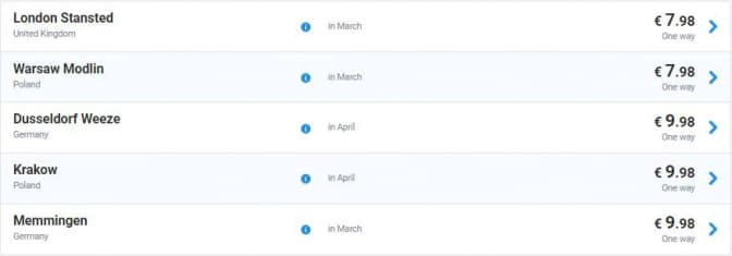 Від 8 євро квитки можна придбати до Лондона та Варшави, а від 10 євро – до Дюссельдорфа, Кракова, Меммінгена. Акційні квитки можна купити на сайті авіаперевізника.