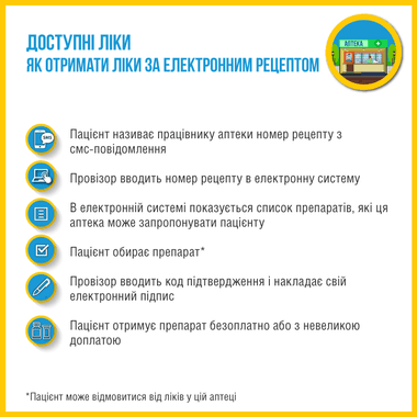 У МОЗ зазначають, що скористатися програмою «Доступні ліки» можуть лише ті пацієнти, які підписали декларацію. Тобто електронний рецепт їм може видати лише той лікар, з яким вони уклали договір. Після виписки електронного рецепта пацієнту має прийти SMS з кодом підтвердження для отримання ліків в аптеці у вигляді: «ХХХХ-ХХХХ-ХХХХ-ХХХХ. Код підтвердження: ХХХХ». Важливо перед виписуванням рецепта уточнити, чи правильний номер мобільного телефону вказаний у декларації.