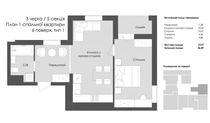 Загальна площа: 46,89 кв. м;