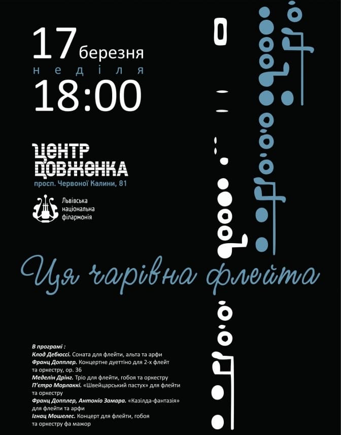Концерт «Ця чарівна флейта» запланований на 18:00. Квитки на нього можна придбати у касах закладів та на kasa.in.ua.