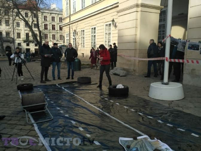 Також під міською радою відбувається пікет ГО «Розвиток громади», які сконструювали дорогу з болота. Таким чином, кажуть протестувальники, «хочуть нагадати проо проблеми у місті, з якими щодня зіштовхуються львів’яни».