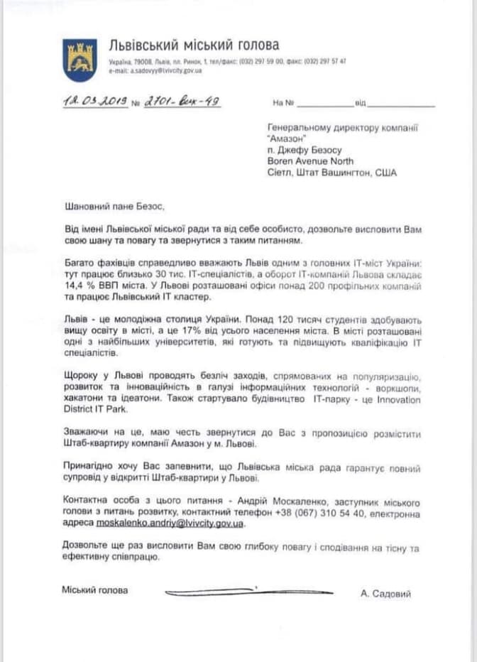 Учора, 12 березня, міський голова Львова Андрій Садовий надіслав листа американській компанії Amazon із запрошенням розташувати свою штаб-квартиру у Львові. Його на своїй сторінці у Facebook опублікував заступник міського голови з питань розвитку Андрій Москаленко. Коли вже у Нью-Йорку домовитись не вдалося, тут готові зустріти компанію більш гостинно.