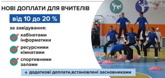 Також вчителі зможуть отримувати від 10 до 20% доплат від зарплати за завідування ресурсними кімнатами, кабінетами інформатики та спортивними залами. Доплати встановлюватиме засновник закладу: область, місто чи район, де розташована школа.