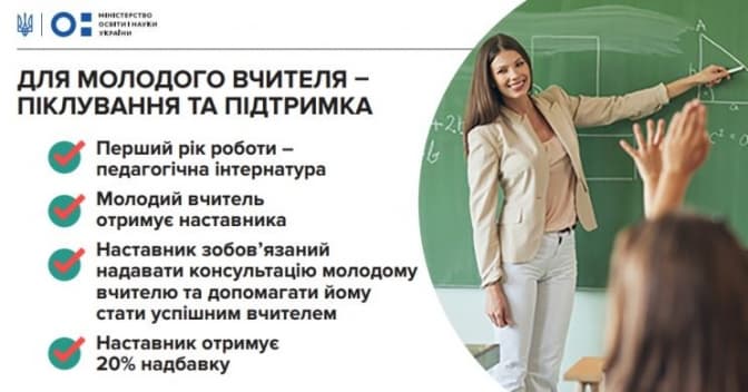 Учитель, який щойно завершив університет, отримає наставника в школі, який консультуватиме, скеровуватиме та опікуватиметься ним. При цьому наставник отримуватиме 20% доплати до зарплати за це, тож буде особисто зацікавлений в успіху молодого вчителя.