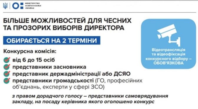 Якщо батьки вбачають проблеми у роботі закладу та вичерпали усі можливості вирішити це разом із адміністрацією школи, вони зможуть ініціювати проведення позапланового інституційного аудиту закладу освіти. Колектив школи та батьки відіграватимуть дорадчу роль під час виборів нового керівника, але сам конкурс проводитиме незалежна комісія. Обов’язковою є відеотрансляція та відеофіксація вибору директора, який, згідно із законопроектом, отримає більшу фінансову та кадрову автономію.