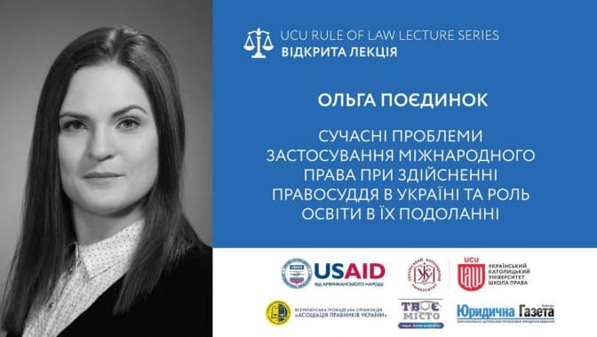 Школа права УКУ за підтримки програми USAID «Нове правосуддя» продовжує серію відкритих лекцій у рамках проекту UCU Rule of Law Lecture Series. Із лекцією «Сучасні проблеми застосування міжнародного права при здійсненні правосуддя в Україні та роль освіти в їх подоланні» сьогодні, 19 березня, виступатиме голова Комітету Асоціації адвокатів України з юридичної освітньої політики Ольга Поєдинок.