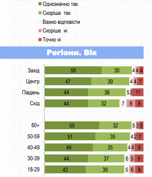 Варто зазначити, що, згідно з результатами опитування, лише 23% мешканців Західної України вважають, що Україна рухається в правильному напрямку. Проте це найбільш оптимістичний показник по Україні в цілому.