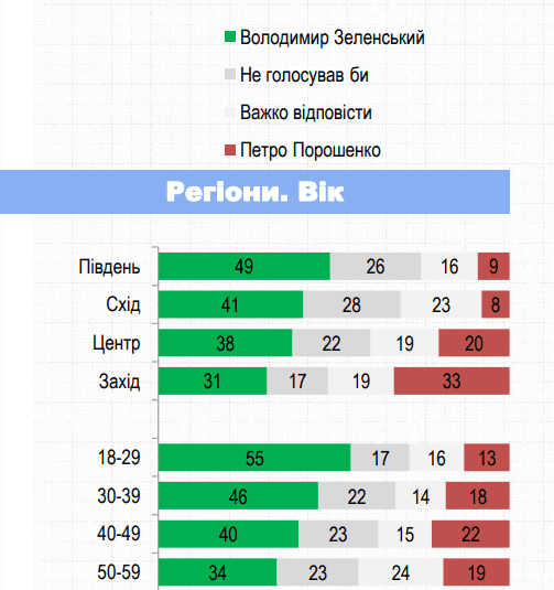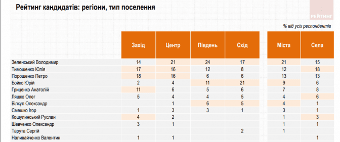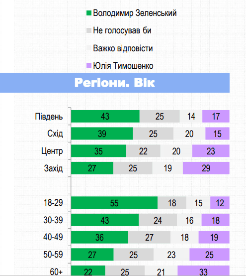 У Центрі, на Півдні та Сході лідирує Володимир Зеленський, який, згідно з результатами дослідження, лідирує загалом по Україні з результатом 24,9% серед тих, хто голосуватиме і визначився. На другому місці по Україні з результатом 18,8% – Юлія Тимошенко. Її більше підтримують мешканці західних і центральних регіонів. На третьому місці – 17,4% – Петро Порошенко.