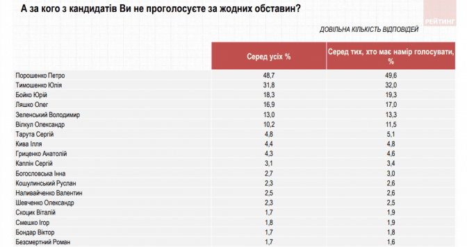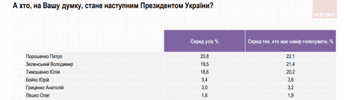 Водночас по Україні половина з опитаних, які підуть голосувати, кажуть, що в жодному разі не проголосують за Петра Порошенка, а третина – за Юлію Тимошенко. Разом з тим, 22,1% з тих, хто голосуватиме, вважають, що наступним президентом буде Петро Порошенко, 21,4% – Володимир Зеленський, 20,2% – Юлія Тимошенко.