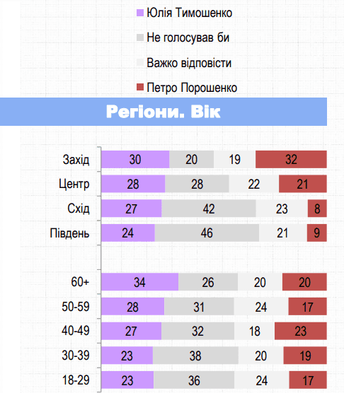 Опитані мешканці Західної України розділились майже порівну у думках про другий тур у випадку, якщо у нього вийдуть Петро Порошенко і Юлія Тимошенко: 32% і 30% підтримки відповідно. Решта регіонів віддадуть перевагу Юлії Тимошенко.