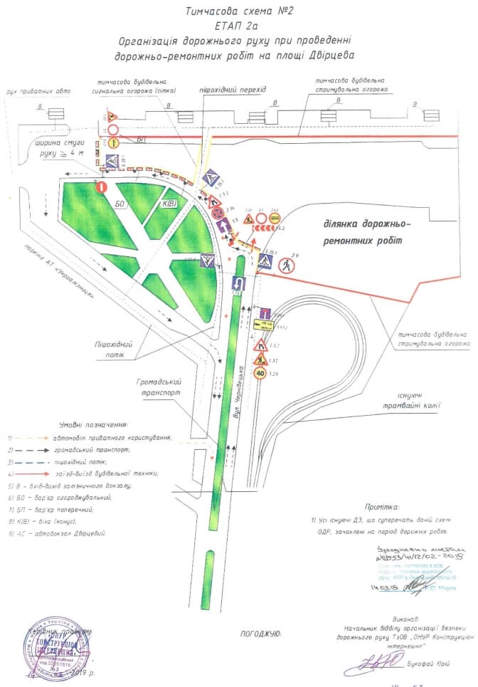 Рух транспорту біля вокзалу з 8:00 22 березня до 8:00 26 березня організують за схемою нижче.