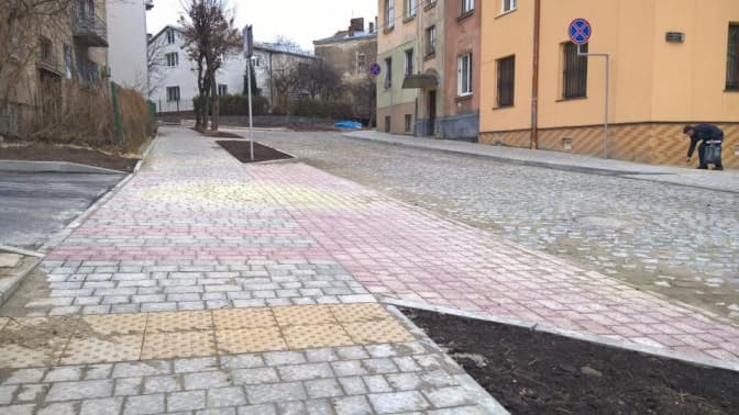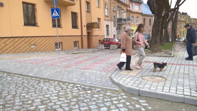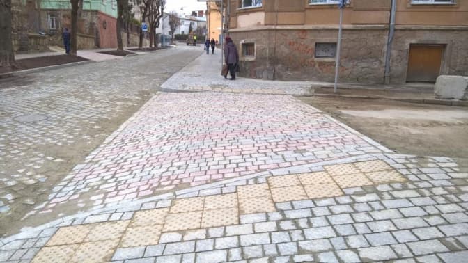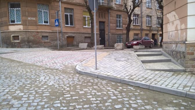 Тротуари – неперервні, а при заїздах на бокові вулиці влаштували підвищені пішохідні переходи. В подвір’я водії також заїжджатимуть через пандус.