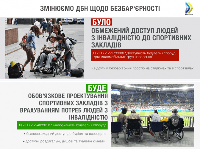 У нових Державних будівельних нормах, що вступили в дію з 1 квітня, ввели обов'язкові вимоги щодо влаштування безперешкодного доступу як ззовні, так і всередині стадіонів, спортзалів та інших закладів спорту. Про це повідомляє заступник міністра регіонального розвитку, будівництва та житлово-комунального господарства Лев Парцхаладзе на своїй сторінці у Facebook.