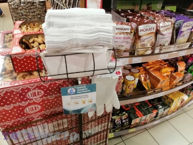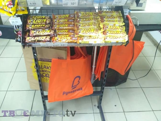 У супермаркеті «Рукавичка» залишилися поліетиленові пакети у відділах солодощів, овочів, фруктів. Альтернативне пакування є у відділі випічки. На касі можна придбати паперові пакети та багаторазові торбинки. Крім цього, покупцям дозволяють купувати продукти у власну тару та пропонують бонуси.