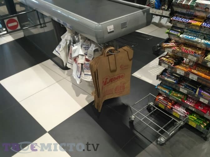 У супермаркеті АТБ паперові пакети та багаторазові торбинки пропонують на касі, а в самій торговій залі залишилися поліетиленові.