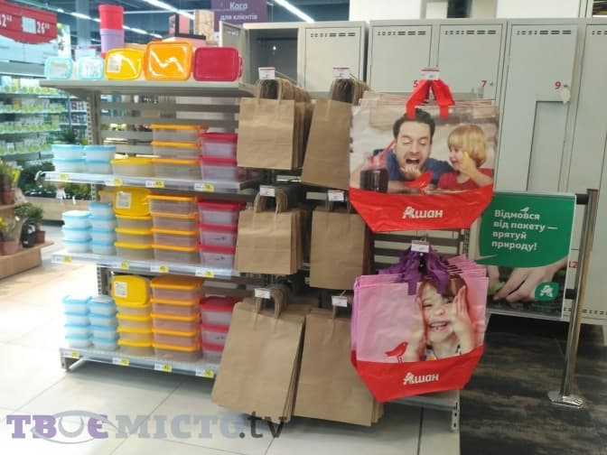 Директорка мережі «Ашан» у Львові Тетяна Герасимова під час брифінгу розповіла, що альтернативне пакування з’явилося сьогодні по всій мережі у Львові, тобто у трьох супермаркетах. Замість поліетиленових рукавичок залишили спеціальні щипці, лопатки та силіконові прихватки. Загалом, за її словами, поліетилен у супермаркетах ще залишать, оскільки є такі продукти, які поки що не можна спакувати в щось інше, наприклад, рибу чи м’ясо. Проте на касі та у відділі овочів і фруктів пропонують альтернативу — багаторазові мішечки, паперові пакети та контейнери.