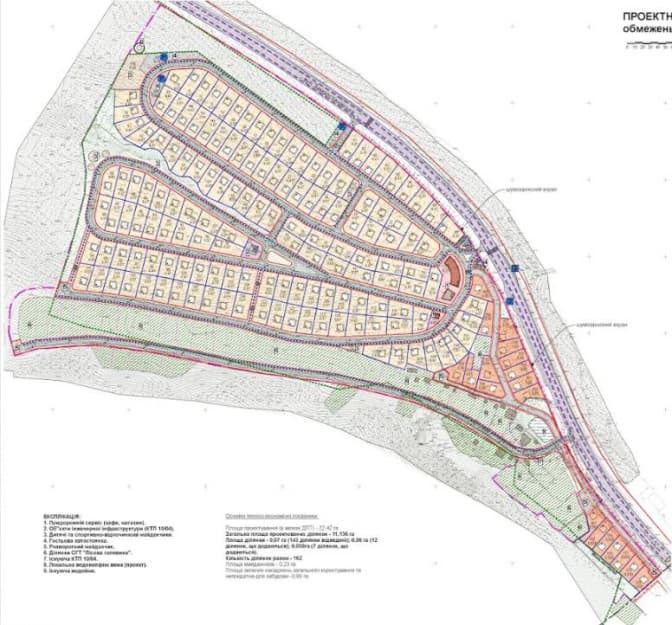 Згідно з детальним планом території, який затвердили за кілька днів до виділення ділянок, тут планували будівництво 143 дачних будинків на один або два поверхи з мансардою. Площа кожної ділянки приблизно сім «соток». Згідно з новим розпорядженням, територія дачної забудови суттєво збільшиться.
