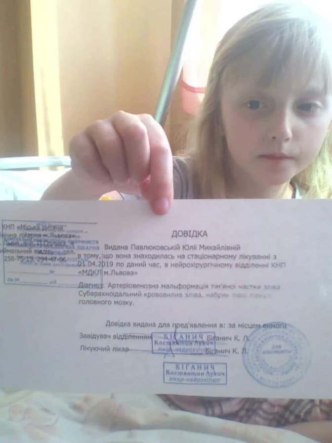 У дівчинки через вроджену аномалію судин головного мозку стався крововилив. Для одужання їй потрібна операція із встановлення трьох спеціальних дренажерів, вартість яких становить 70 тис. грн за один. Діагноз дівчинки – артеріовенозна мальформація тім’яної частки зліва, субарахноїдальний крововилив злів, набряк.
