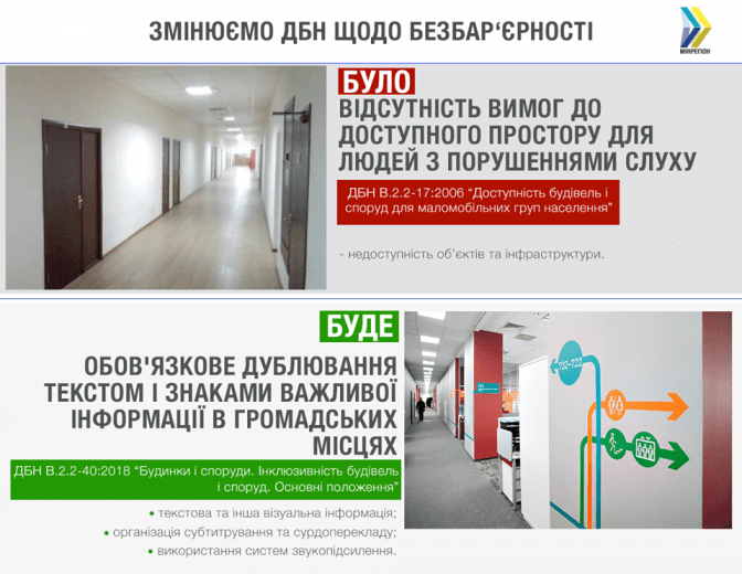 У оновлених Державних будівельних нормах, які запрацювали в Україні з 1 квітня, запровадили обов’язкове візуальне інформування для людей з порушеннями слуху при проектуванні громадських закладів. Про це на своїй сторінці у Facebook повідомив заступник міністра регіонального розвитку Лев Парцхаладзе.