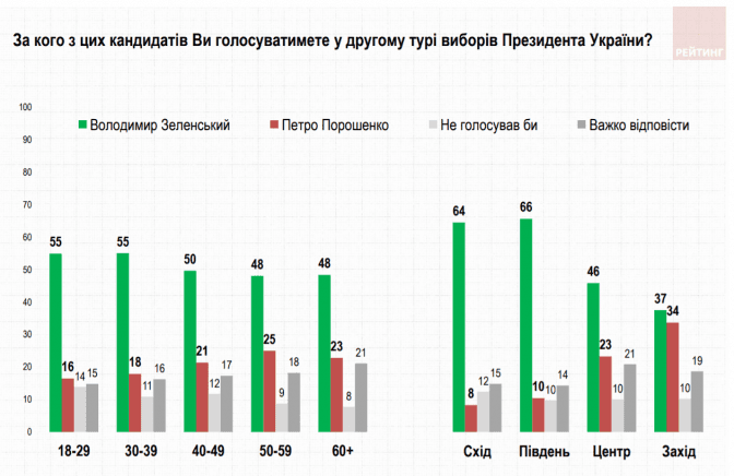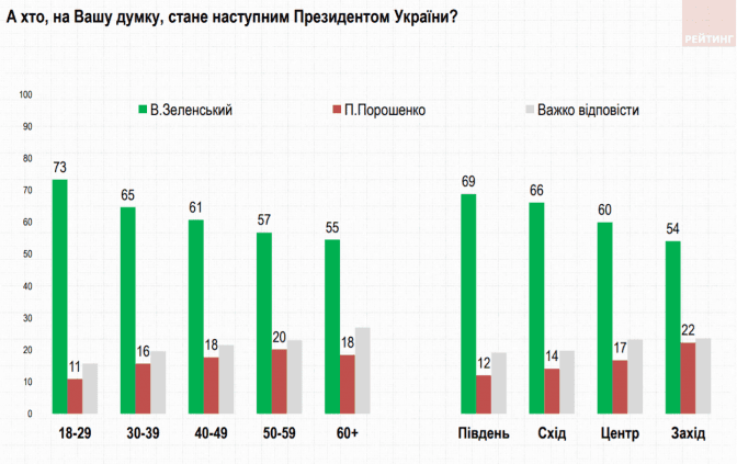 Якщо раніше найбільша частка опитаних вірила в перемогу на виборах чинного президента, то зараз 61% опитаних вважає, що президентом стане Володимир Зеленський. У перемогу Петра Порошенка ж вірять лише 17% респондентів. На Західній Україні ці показники становлять 54% та 22% відповідно.