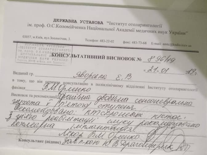 Дівчині потрібна кохлеарна імплантація – операція з імплантації у вухо електродів, що виконують функцію пошкодженої ділянки слухового аналізатора. Про це дівчині сказали в Інституті отоларингології імені Коломійченка у Києві. Вартість такої системи – понад 803 тисячі гривень.