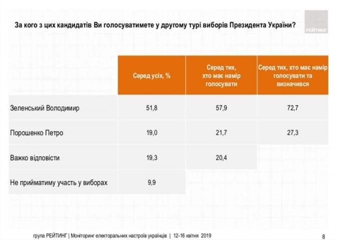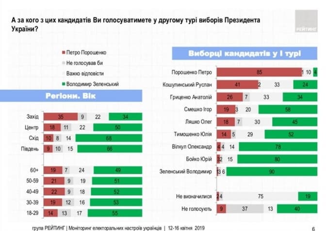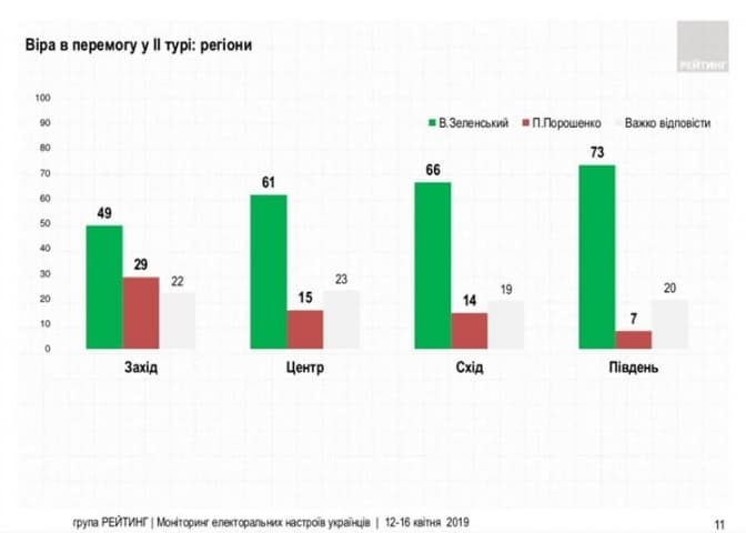 Якщо раніше найбільша частка опитаних вірила в перемогу на виборах чинного президента, то зараз 62% опитаних вважає, що президентом стане Володимир Зеленський. У перемогу Петра Порошенка ж вірять лише 17% респондентів. На Західній Україні ці показники становлять 49% та 29% відповідно.