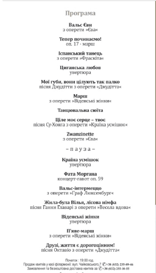 У програмі – оперети австрійця Франца Легара («Країна усмішок» (Das Land des Lächelns), «Весела вдова» (Die lustige Witwe), «Царевич» (Der Zarewitsch) та інші).
