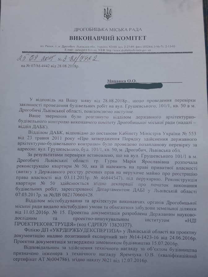 З ДАБК мені надіслали якусь формальну відписку, яка до мене навіть не дійшла, бо фактично проживаю в іншому місці. Учора я забрала її в міськраді. У ній написали, що все добре, згідно з технічними нормами, порушень не знайшли. Ця служба контролює всі перепланування в місті, іншої такої структури немає. Тобто вони так само ставляться і до інших перепланувань, зокрема в другому під’їзді, що обвалився. Мій під’їзд стоїть, але я особисто боюсь туди заходити тепер.