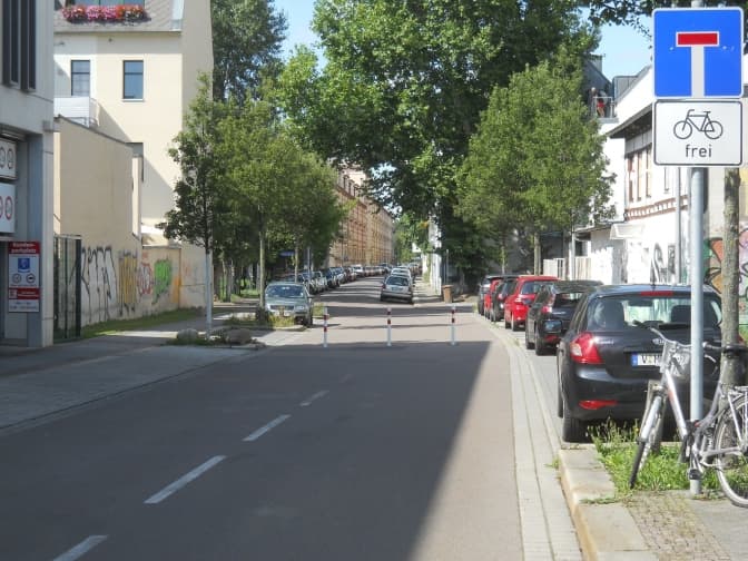 17. Під час громадських слухань щодо відкриття торгового центру у Лейпцигу мешканці висловили побоювання, що на їхній вулиці буде вкрай інтенсивний рух транспорту. І що, ви думаєте, придумали місцеві транспортники? Так, перекрити вулицю. Прохід і проїзд для велосипедистів залишили, але автомобілі не проїдуть. А мешканці вулиці на своїх автомобілях повинні зробити гак. Тобто на вулицю все ще можна заїхати машиною і припаркуватися, але наскрізного руху вже нема.