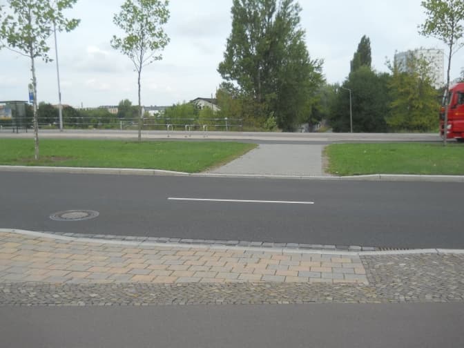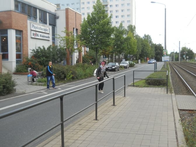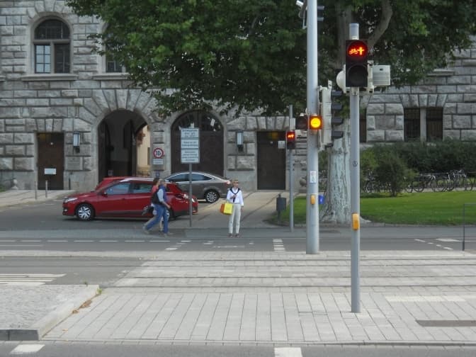 18. У Німеччині є непозначені переходи для пішоходів. У вас на такому переході немає пріоритету, але коли машин немає або вони стоять, ви можете перетинати дорогу. Особливо часто таке рішення застосовують на зупинках трамваїв, навіть якщо на одному кінці є світлофор.