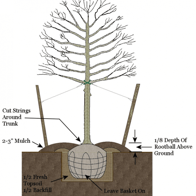 Дерево треба садити так, щоби шийка кореня (самий низ стовбура) не була засипана землею — інакше вона почне підгнивати. Також бажано, щоб шийка кореня була трохи вищу за рівень землі довкола — з розрахунком, що з часом ґрунт всядеться.