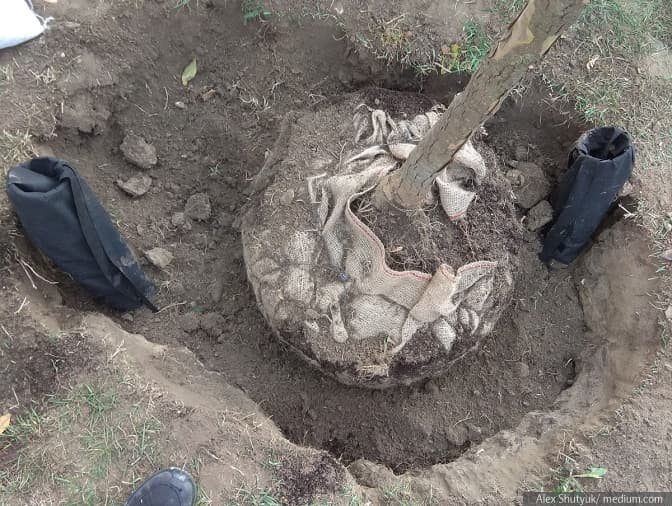 Викопування дерева з відкритого ґрунту — дуже відповідальний процес, від якого напряму залежить, наскільки добре приживеться дерево на новому місці. Важливо акуратно дістати та не пошкодити кореневий ком із землі, загорнути його у мішковину та зафіксувати спеціальною металевою сіткою. Великі садові центри мають для цього спеціальну техніку, яка полегшує та пришвидшує процес. Під час висадки цю сітку ні в якому разі не можна знімати — вона тримає цілісність коріння. Не можна в процесі висадки притоптувати ком ногами. З часом дротики розкладуться у землі. Максимум, що можна зробити, — уже після висадки перекусити кусачками дроти біля самого стовбура, щоби вони не врізалися в нього, коли дерево почне рости.